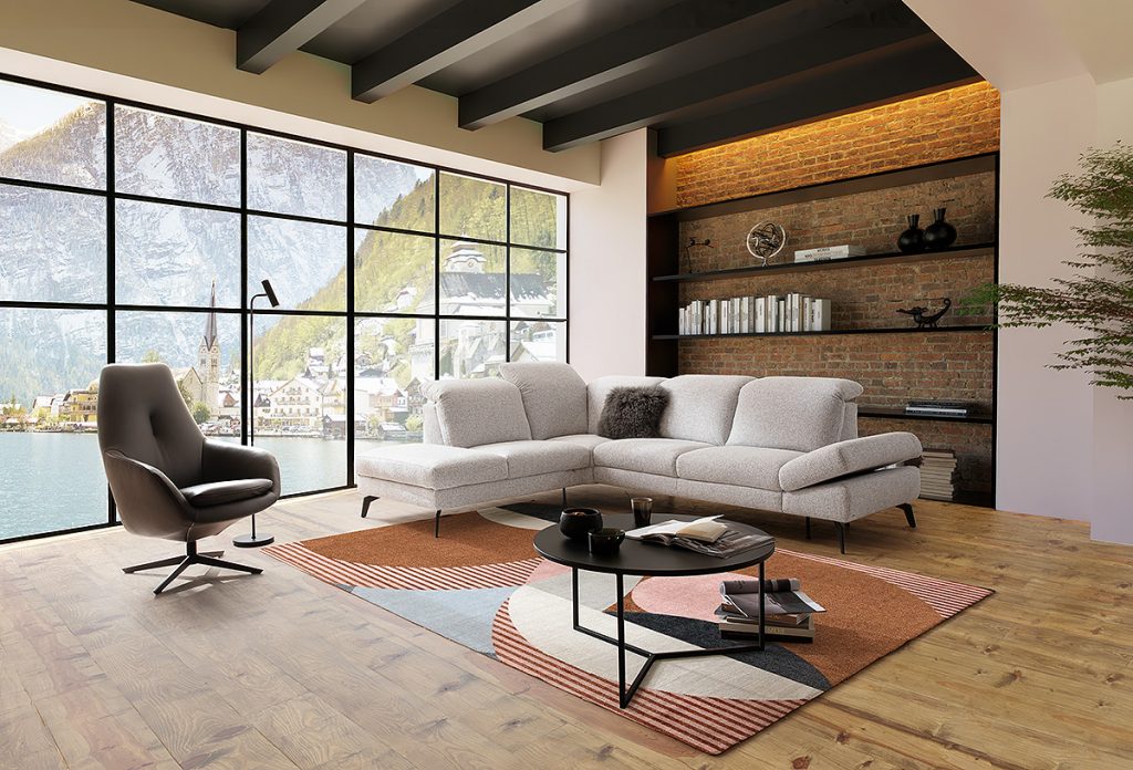 Eckgarnitur BENSON in Stoff Muro light grey, Armlehne “E”, ca. 229 x 262 cm, Metallfuß schwarz, inkl. 5 x Kopfteil-verstellungen und klappbarer Armlehne, Kissen ist Deko