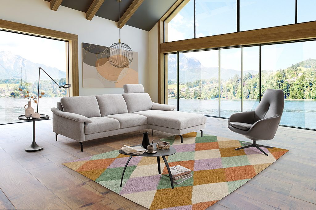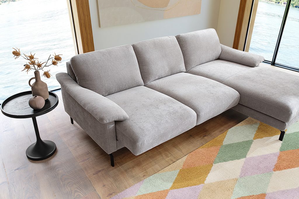 BIONDA, Armlehne “A”, Longchair-Kombination in Stoff Mosa steel, ca. 232 x 177 cm, Metallfuß schwarz, Kopfstütze