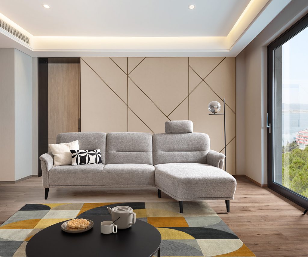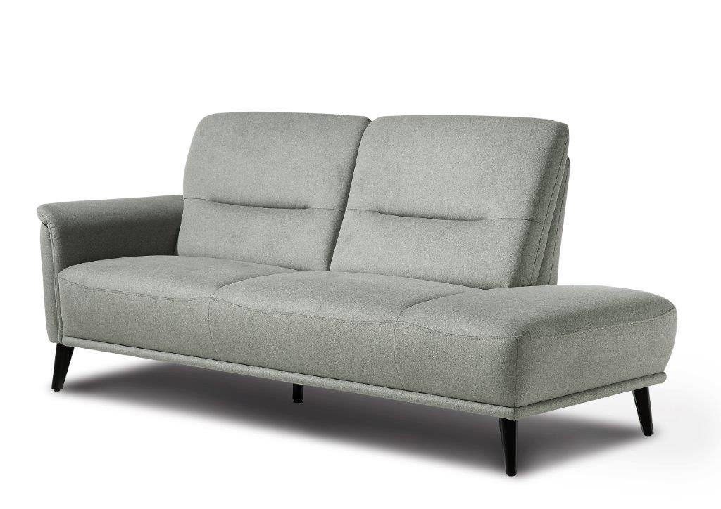 Trapez-Longchair-Kombination in Stoff Catania silber; Armlehne bodenfrei; Rückenvariante mit Kimme; Holzfuß schwarz; Sitztiefe 48 cm; Stellmaß ca. 240 x 150 cm Kissen sind Dekoration